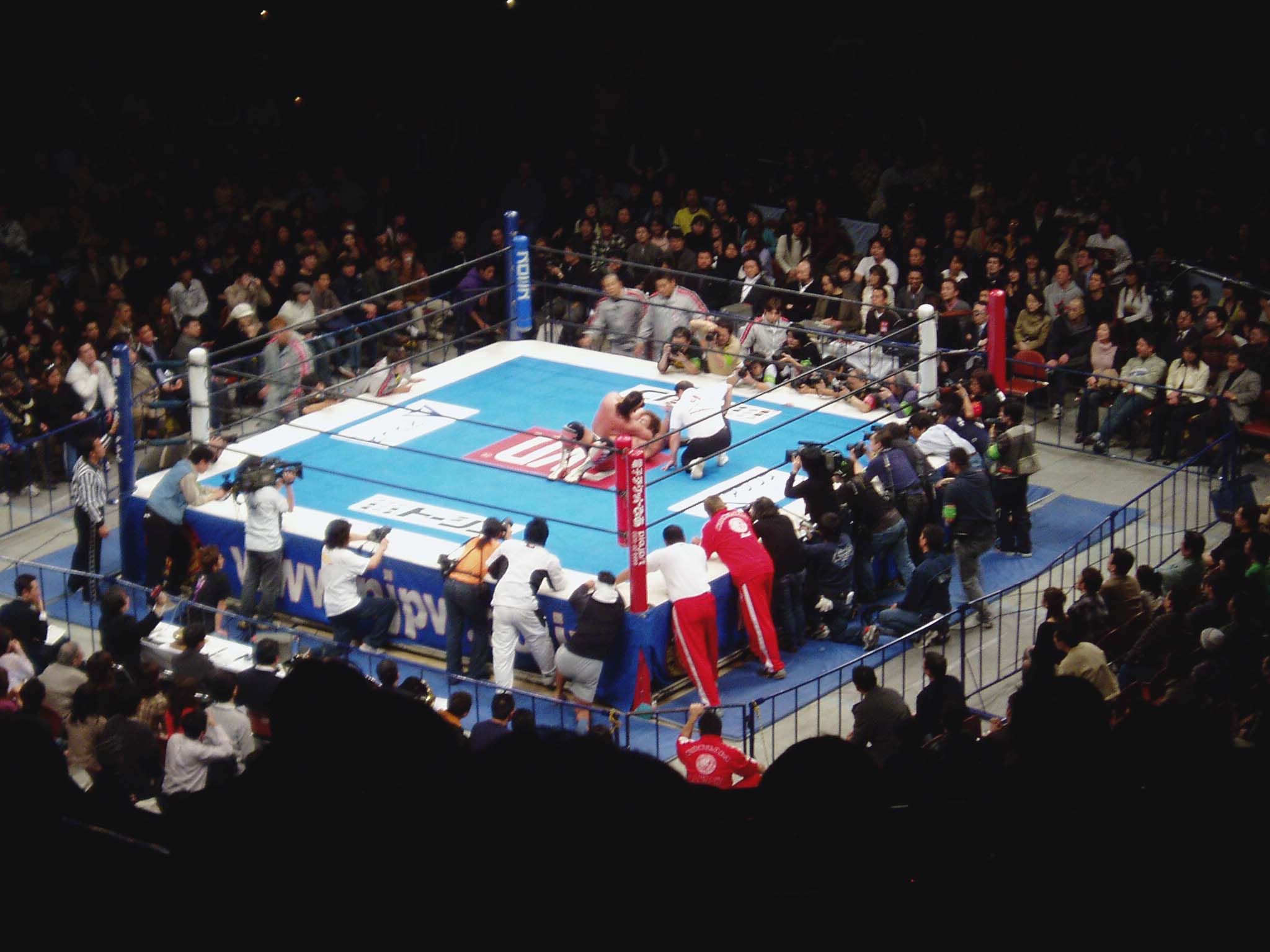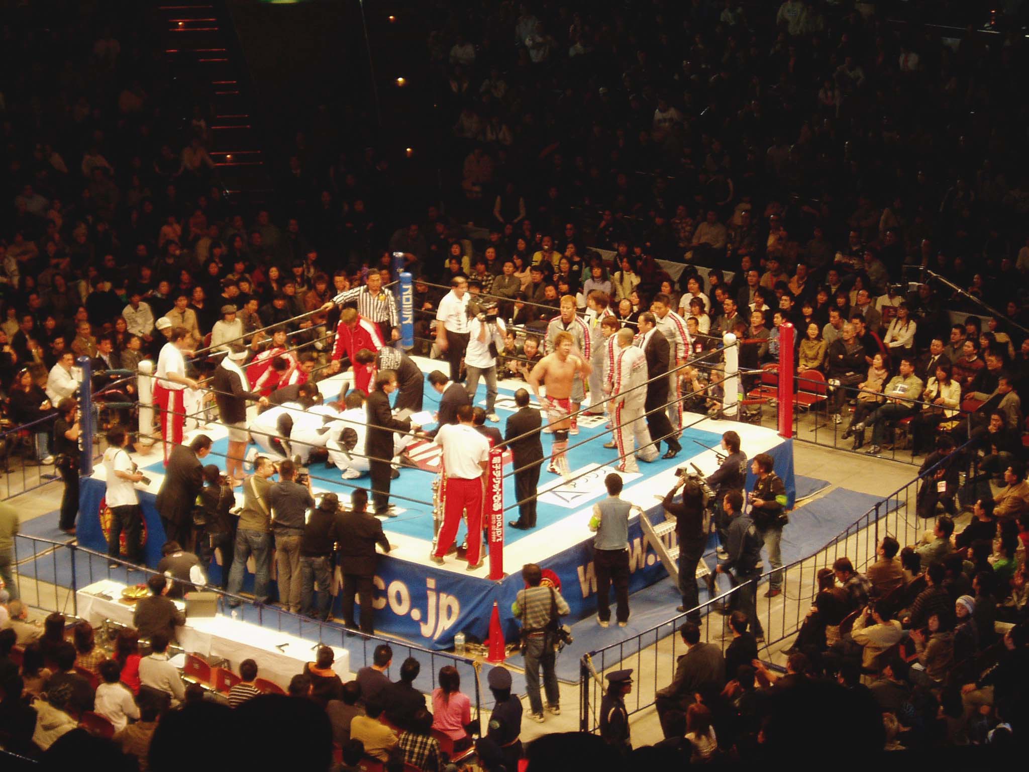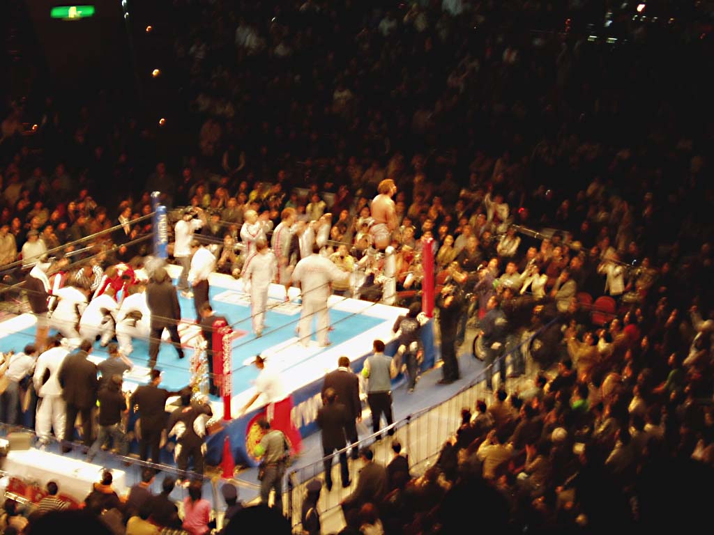 京平レフリーがKO判定を下した直後ぐらいの図。 試合時間が50分超えた辺りから、わかっている人は溜息を漏らして 55分を超えると流石にピュアな人達からも大ブーイング、怒号が聞こえてきたので、京平レフリーの判断は正しかったと思います。 (仮定の話として)この試合がフルタイムドローだとしたら、会場に来ていた人達は失望していたろうし ファンは不信感を抱いて、プロレスを捨てる人も増えていた事でしょう。
