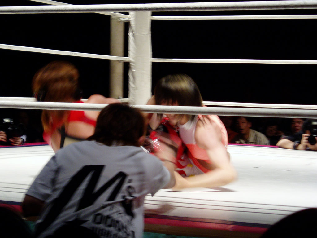 渡辺菜穂の横には様子を心配して試合を続けるか?どうか?を確認する大値レフリーが目を光らせています。
