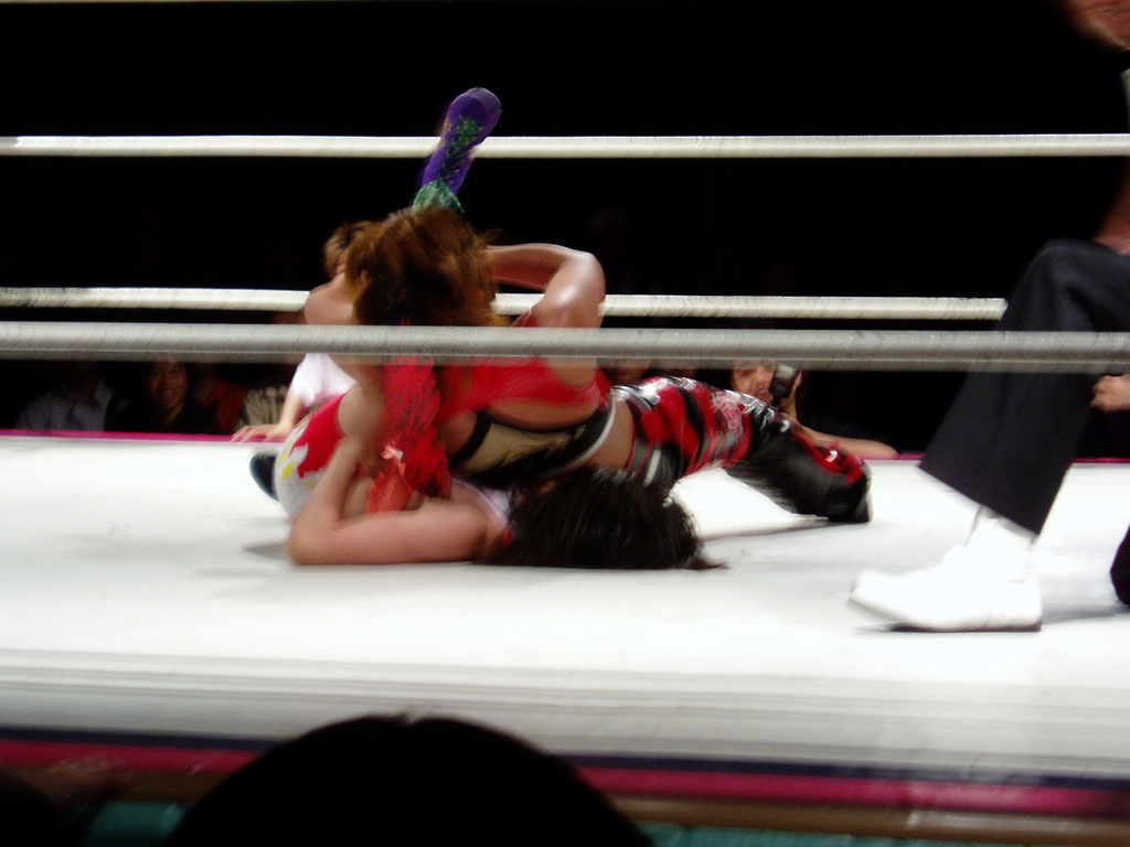 闘獣牙Leonのボストンクラブ(逆エビ固め)でヘロヘロだった渡辺菜穂はここで押さえ込まれて試合終了。