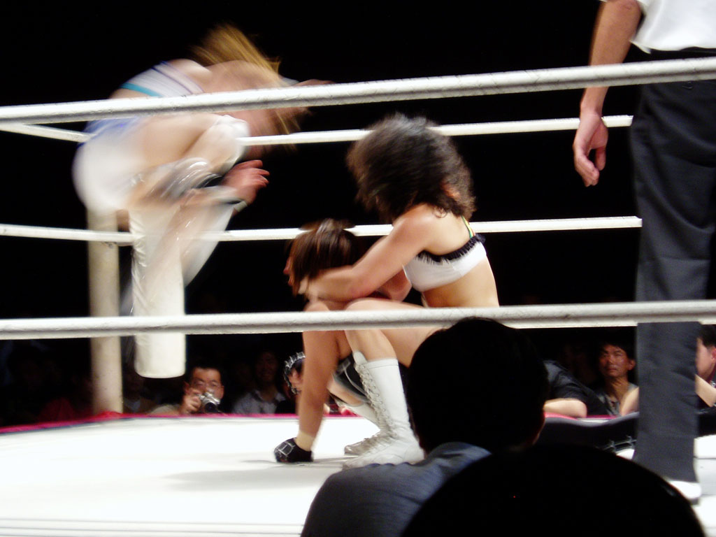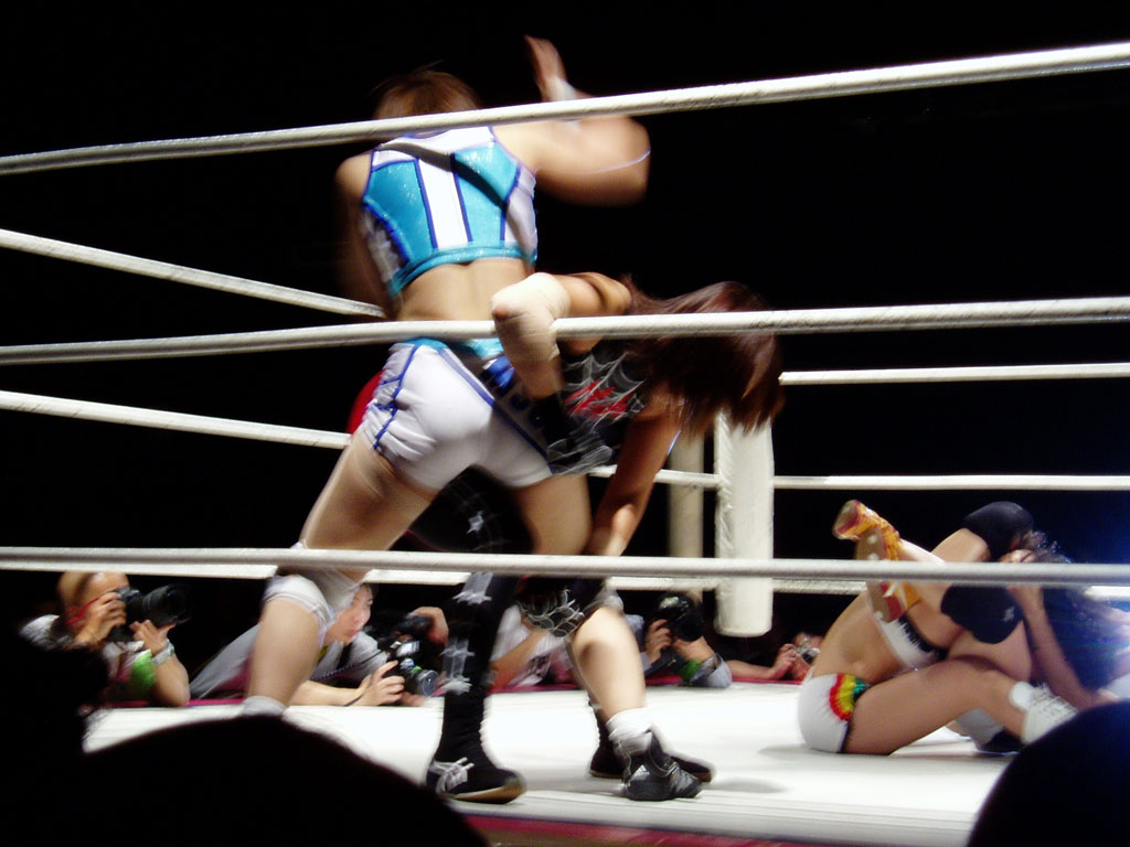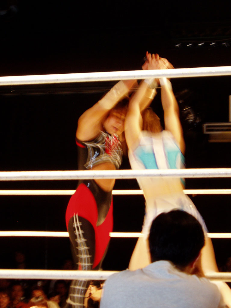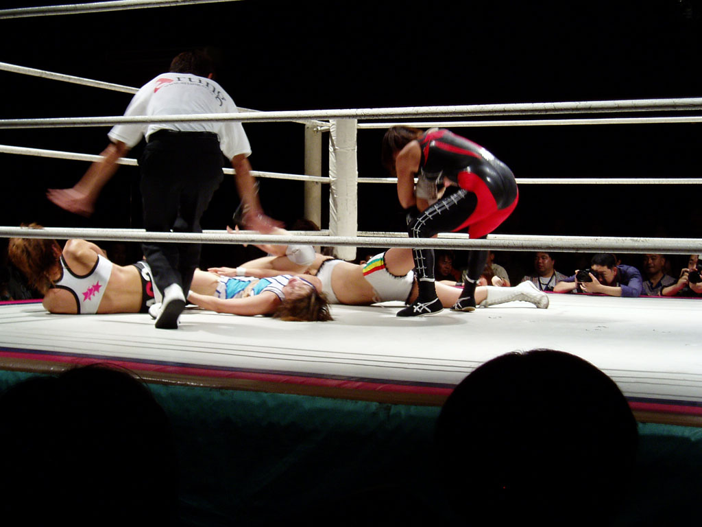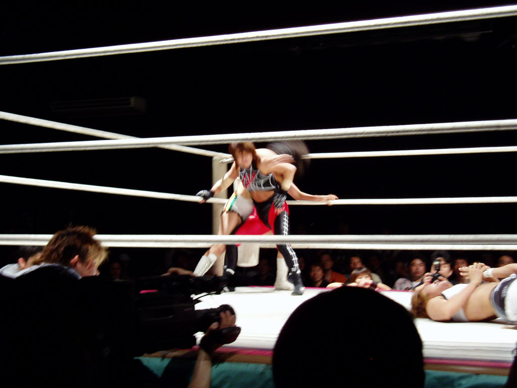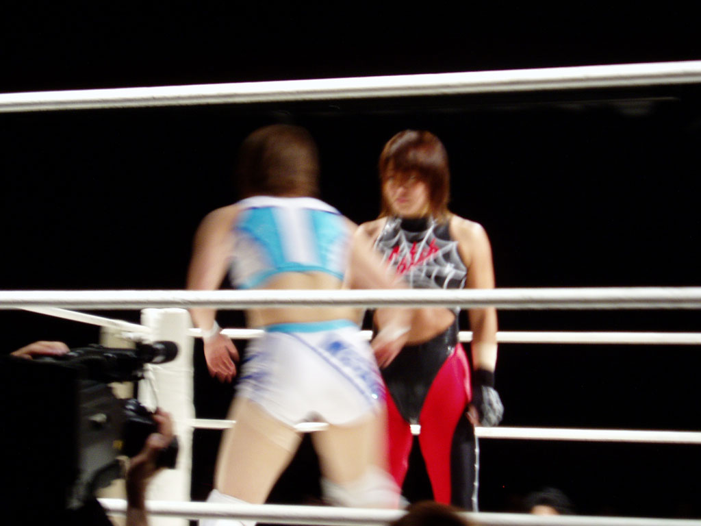 女子プロレスを良く知らない人に説明すると、黒と赤を基調にして蜘蛛の巣の柄のコスチュームを着ている方が吉田万里子です。