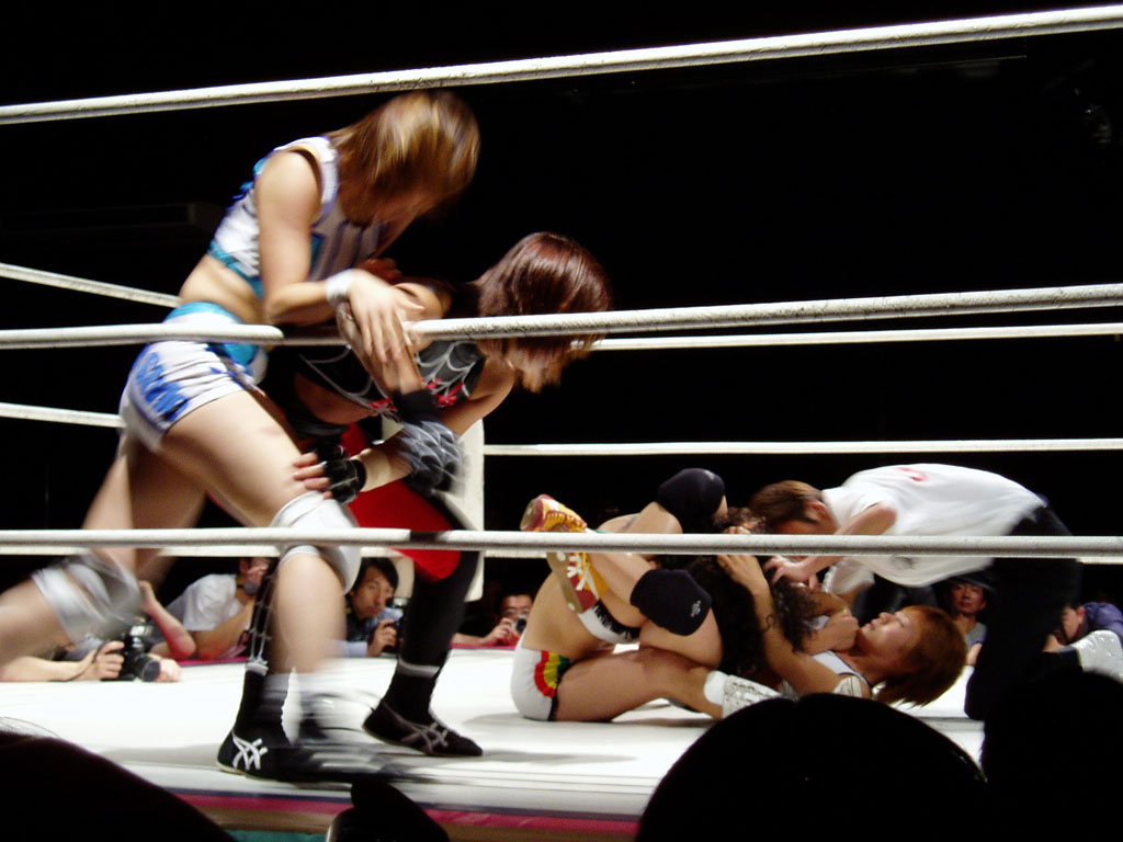 新人コンビ(栗原あゆみと木村響子)が吉田万里子と藤井恵の関節技地獄に掴まってしまっている図。