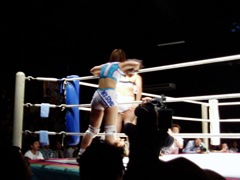 吉田万里子が反対側のコーナーポストに木村響子を抑えつけていて